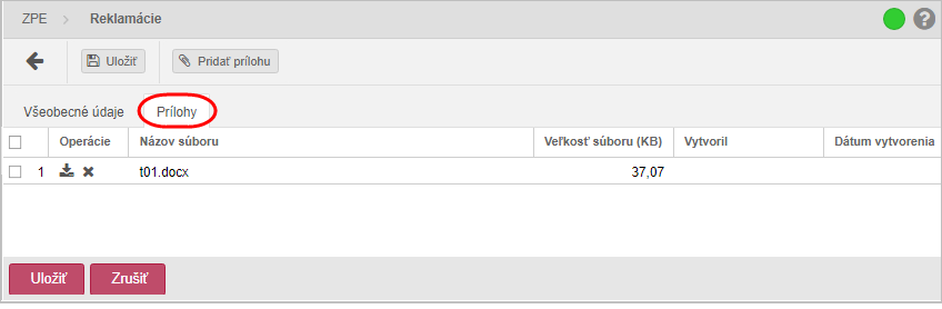 Stiahnuť súbor - stlačením ikonky sa vykoná stiahnutie súboru prílohy pripojenej k reklamácii, následne systém zobrazí štandardný systémový dialóg pre preberanie súboru špecifický podľa operačného systému a typu internetového prehliadača.